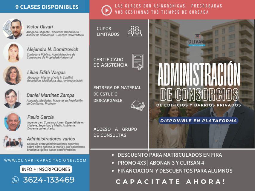 Curso interdisciplinario con más de 5 docentes, referido a la administración de consorcios de propiedad horizontal, es decir edificios y barrios privados o cerrados. Formación de excelencia con reconocidos docentes y en base a contenidos modernos ubicados en el presente contexto
